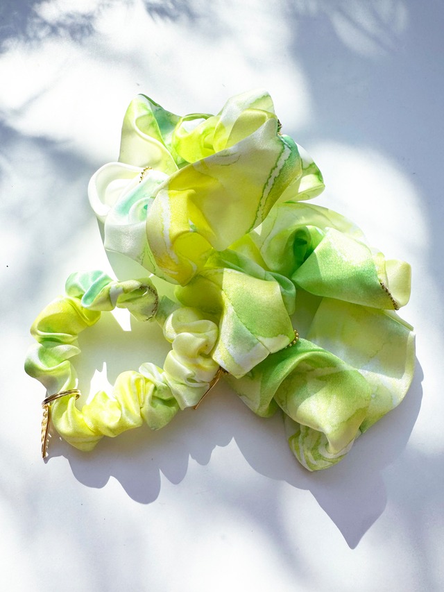 accoオリジナル生地ミラクルファブリックでお作りした、 着けると気分ハッピー、HAPPYシュシュ♪ こちらはサテン生地でお作りしています。 ヘアアクセとして 腕元のアクセントとして 家事の時の袖止めとして 使い方は無限大! お子様とお揃いもオススメです♪ 絵柄:新緑の季節 チャーム:羽 ※ブラウザによって実際の色味と異なる場合があります ※価格は1個あたりのものです。